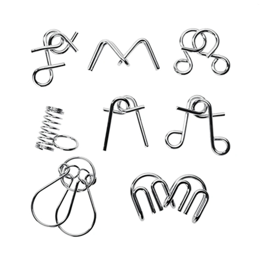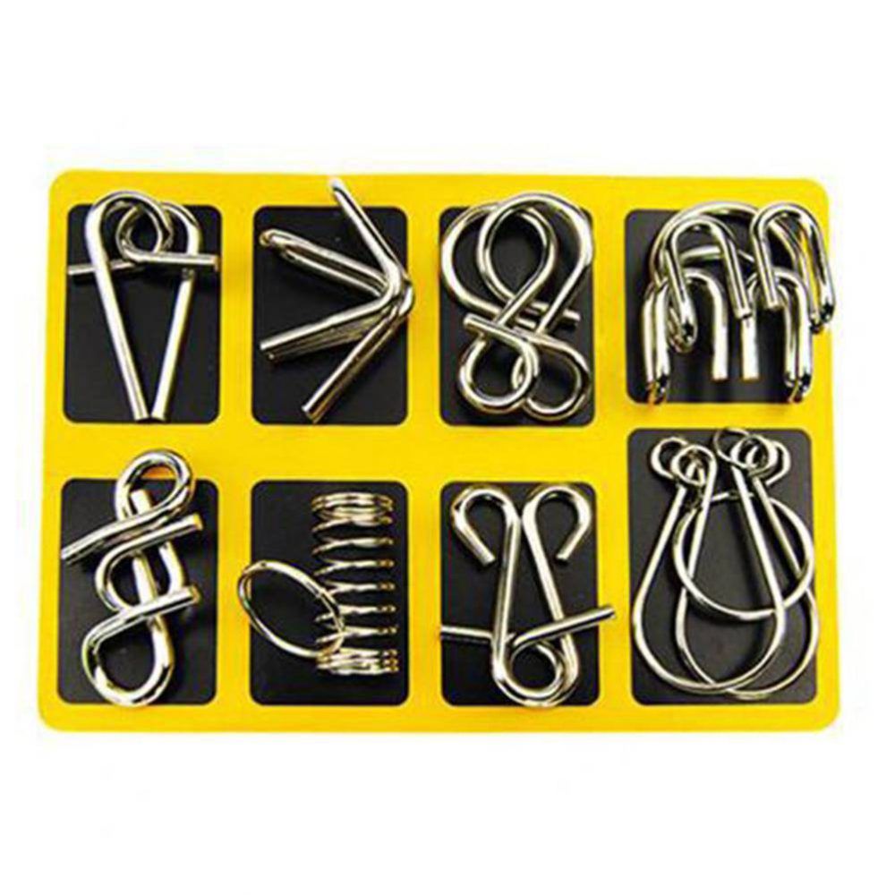 Set of 8 metal puzzles to keep your hands and mind busy figuring out how to unlock them.
