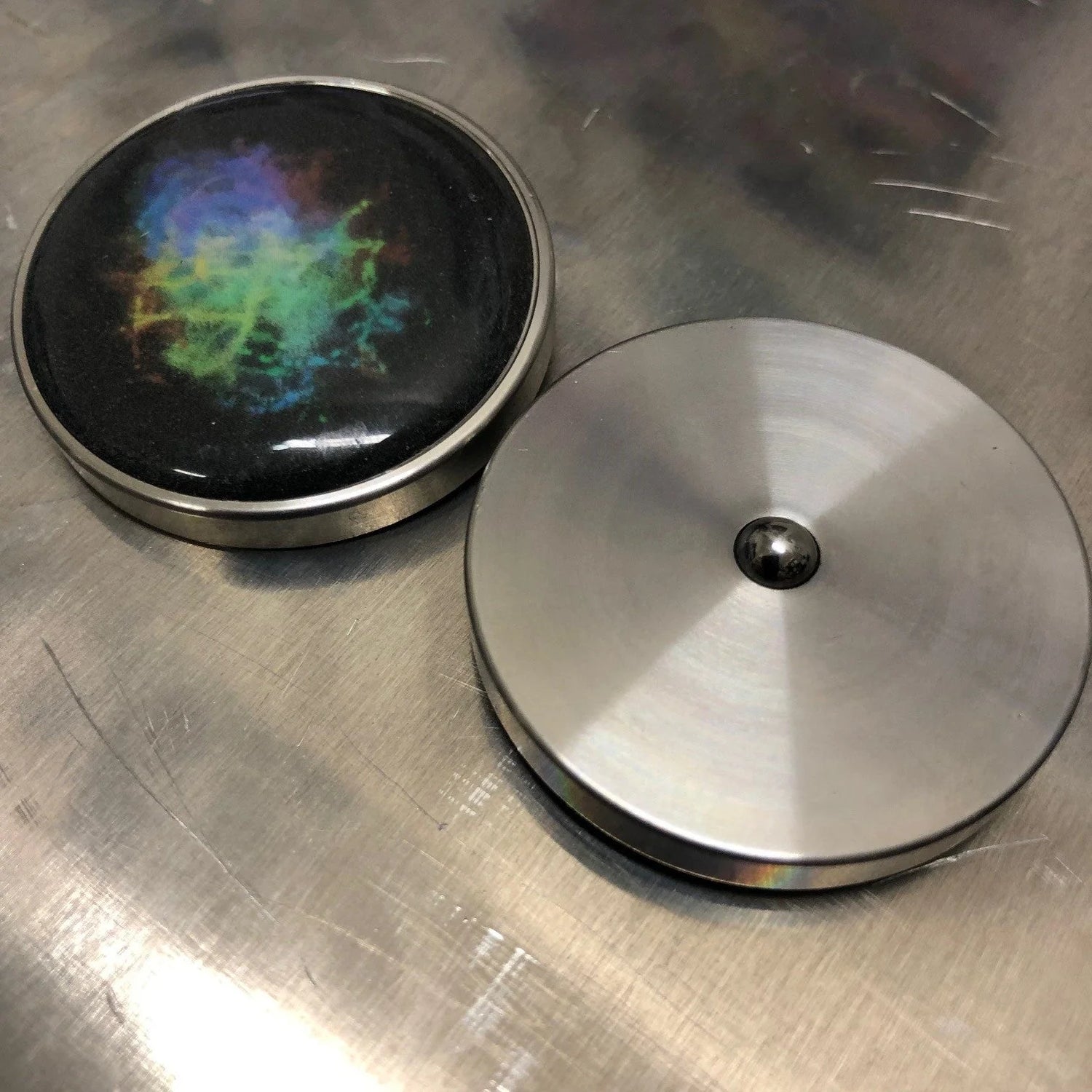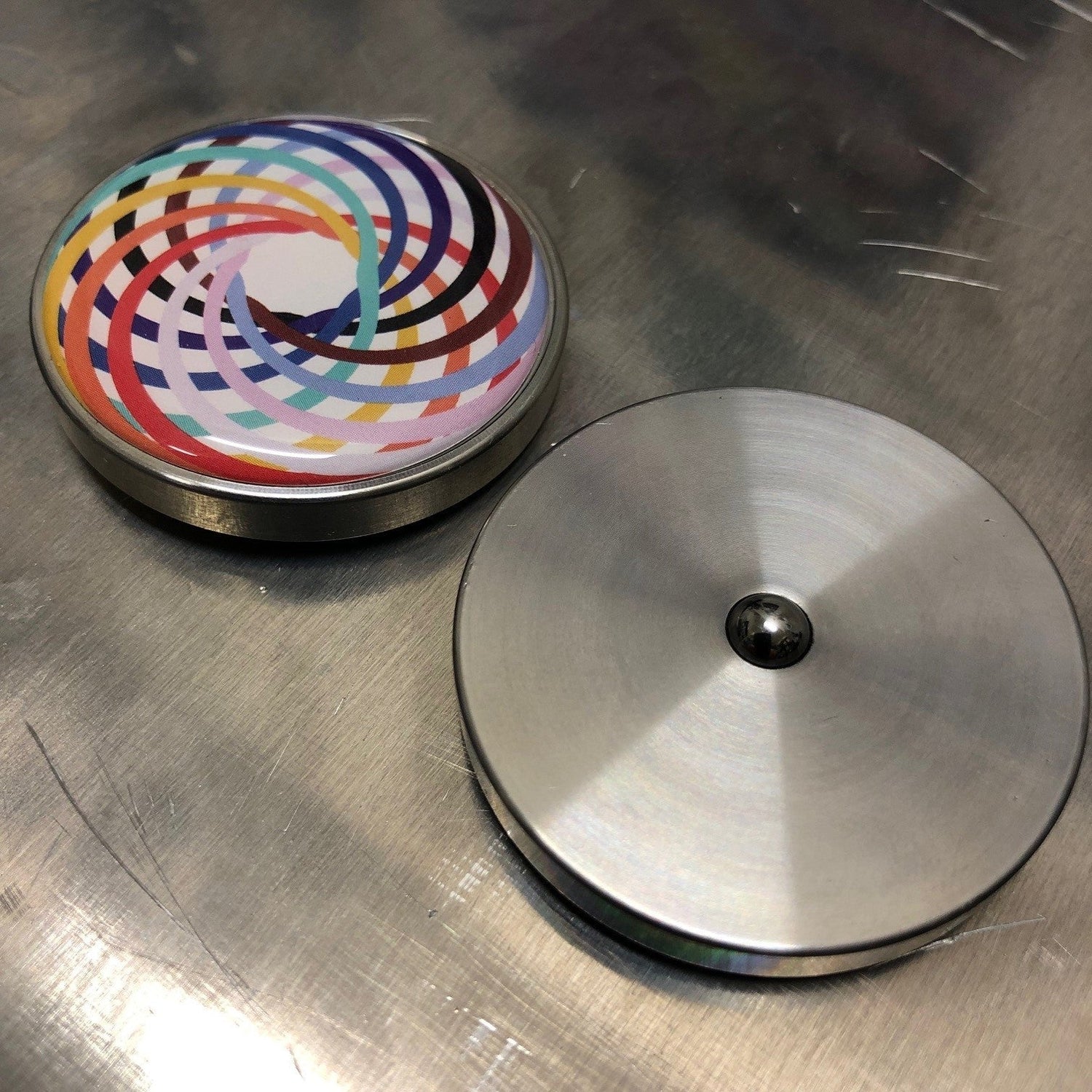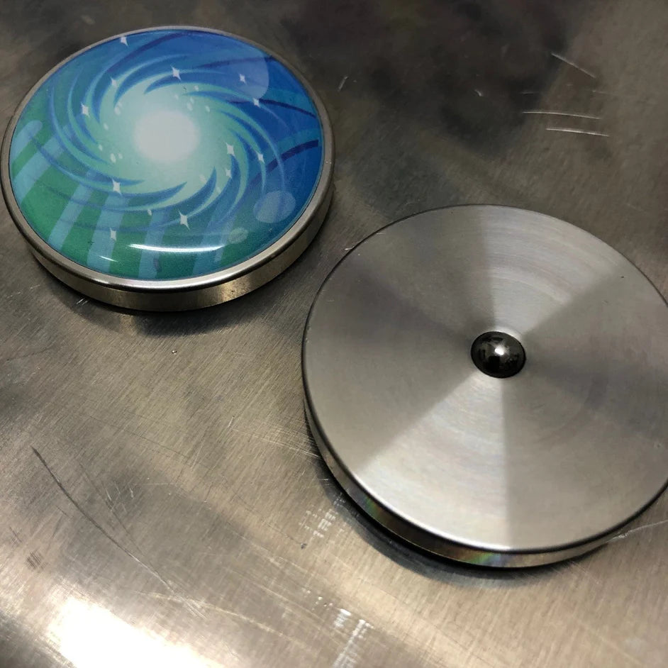 These stunning small discs of spinning colour delight are made from resin and stainless steel. Spin and be mesmerised by their beauty & colour. A wonderful visual stim!